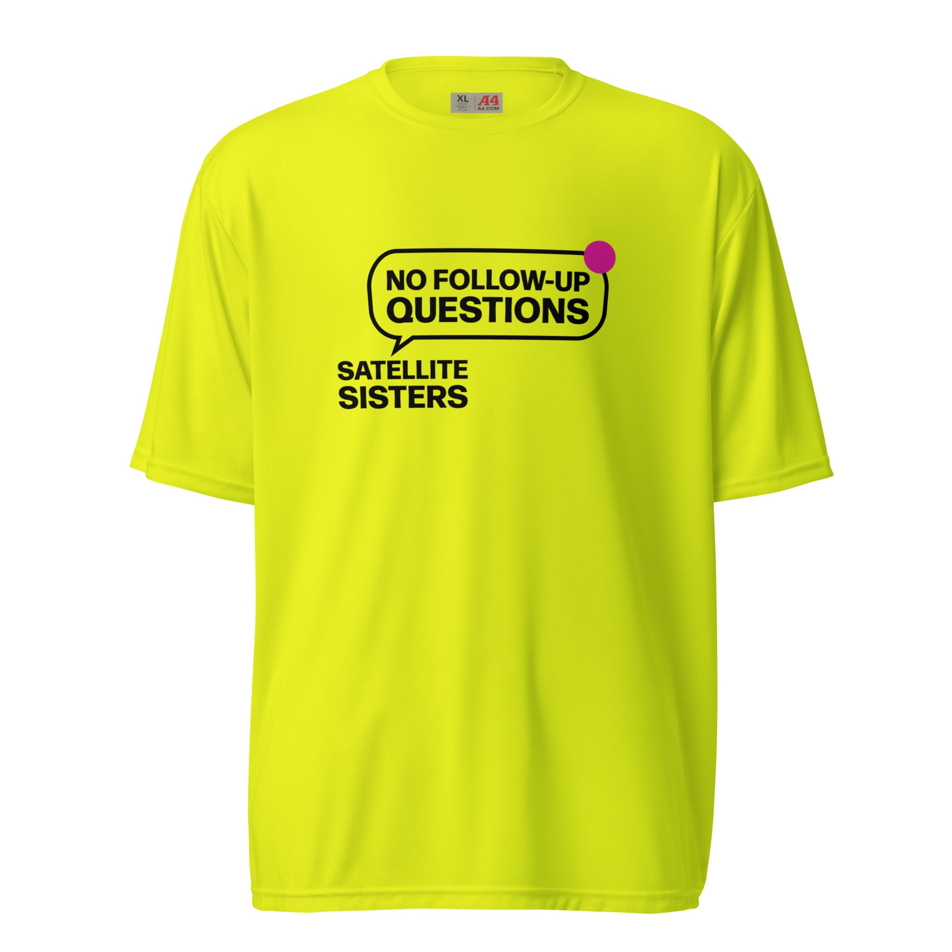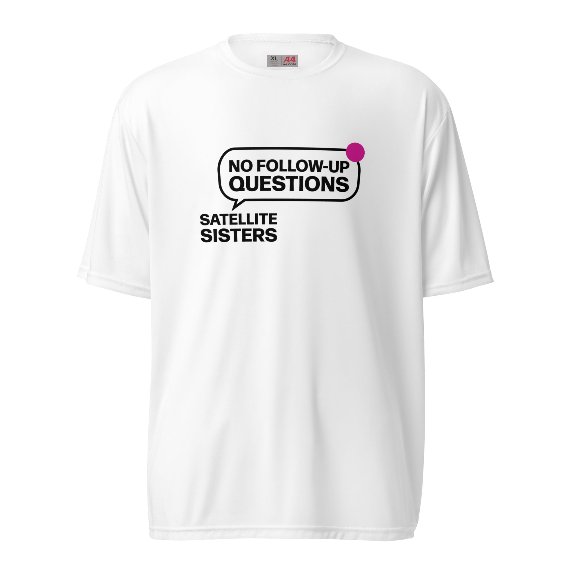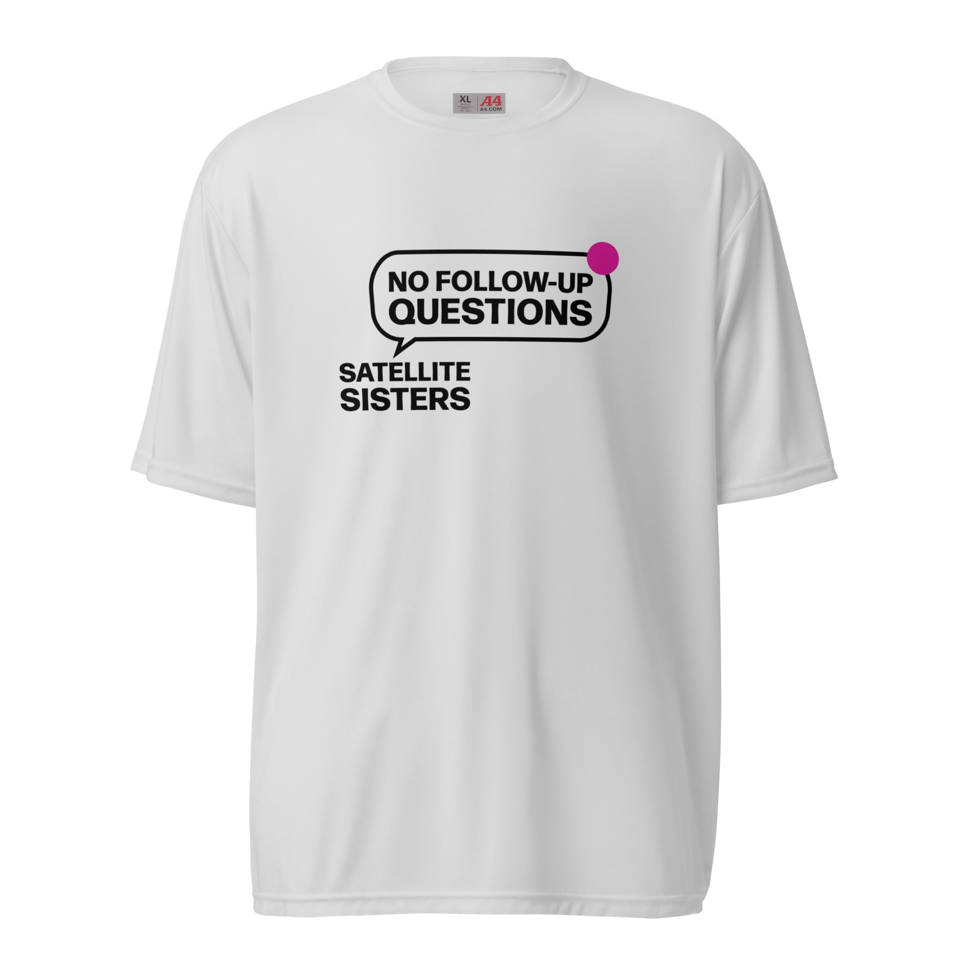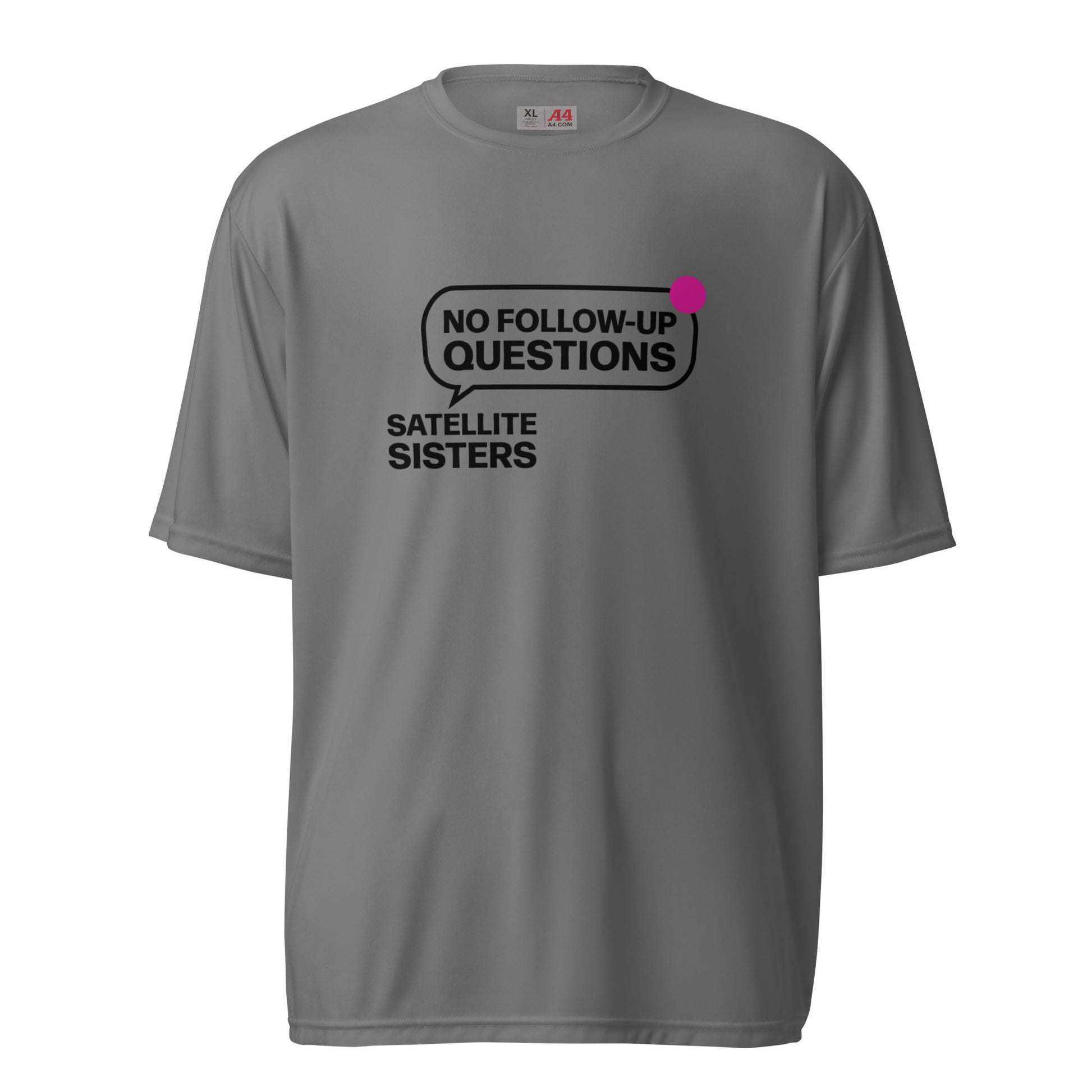 No Follow Up Questions! One of the favorite Satellite Sisters responses when we don't know what we are talking about. Made from premium, moisture-wicking fabric with odor resistance, stain release, and UV protection, this shirt’s perfect for going to the gym, playing sports, hiking, even pickleball! Several light color choices with dark type.