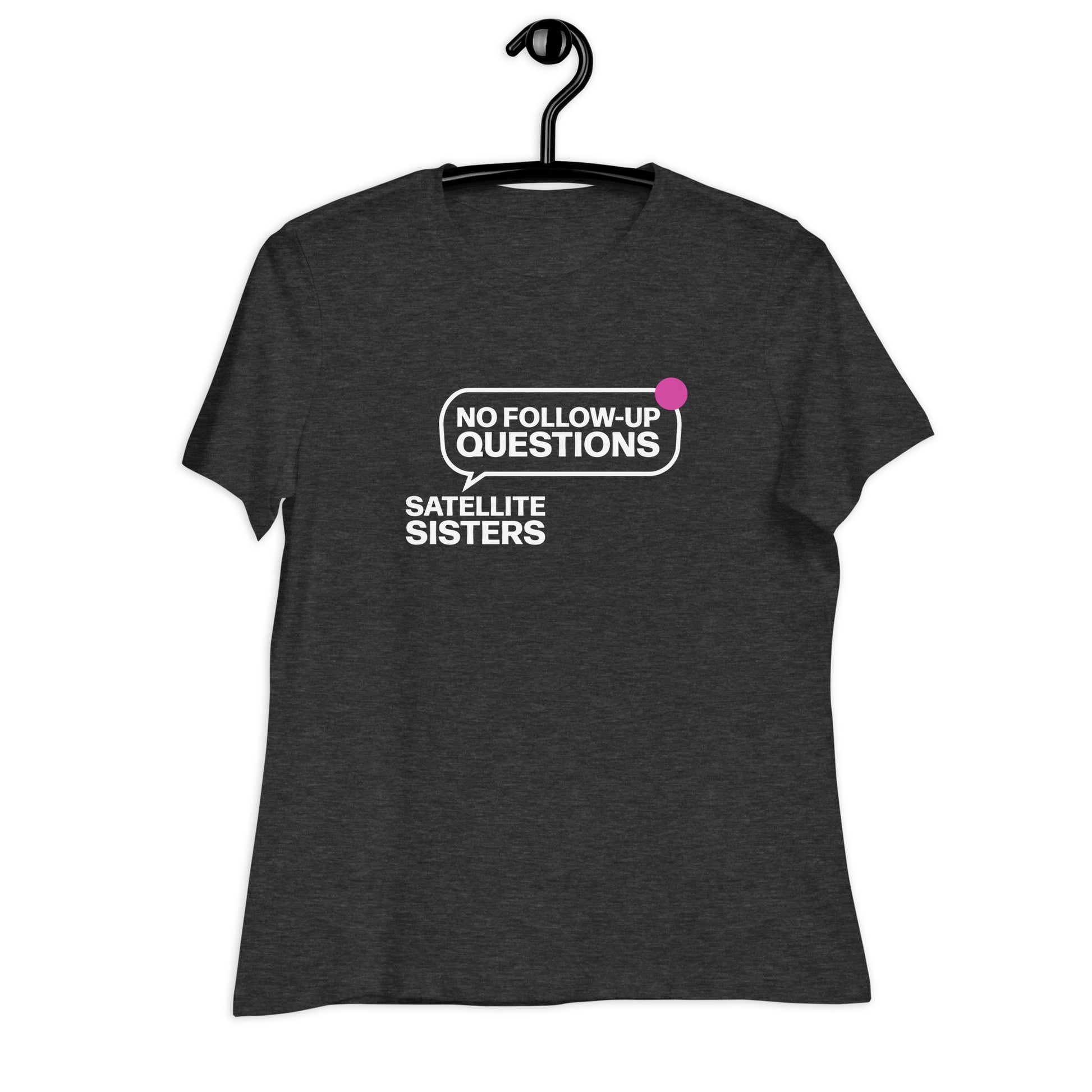 No Follow Up Questions. Our favorite Satellite Sisters phrase when we don't know what we are talking about. This version is white type on several choices of dark colors. This just might be the softest and most comfortable women's t-shirt you'll ever own.
