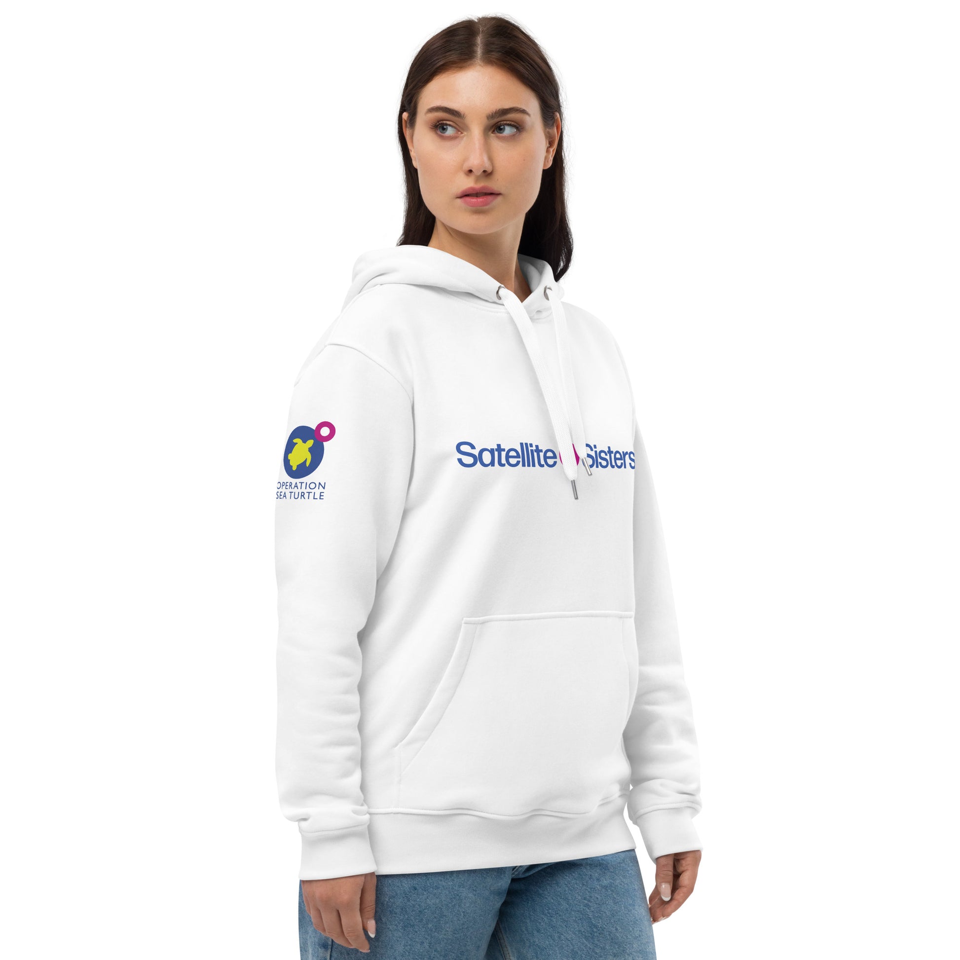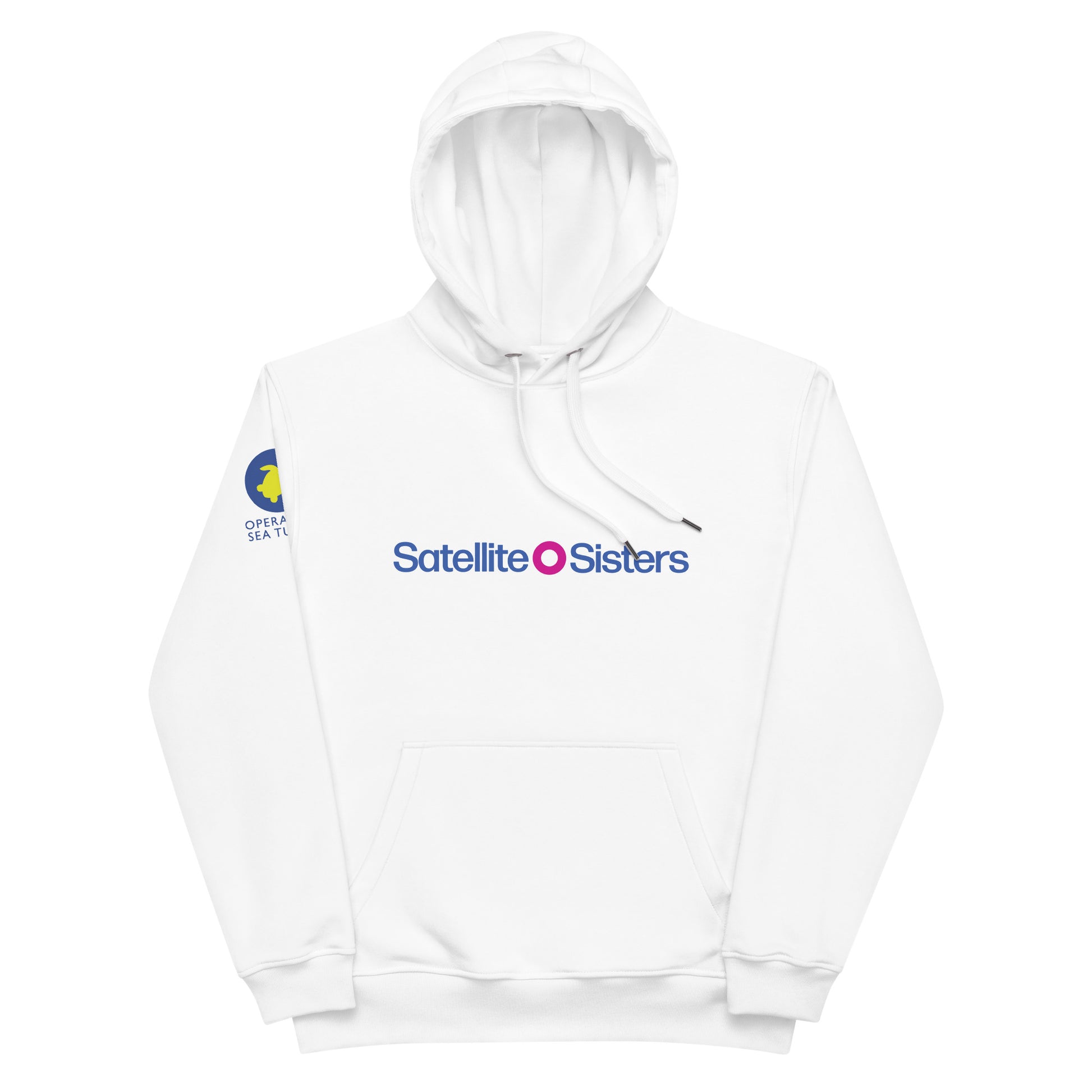 This premium eco hoodie made of organic and recycled materials has the Satellite Sisters logo across the front and the Operation Sea Turtle badge on the right sleeve. With its comfortable fit, front pouch pocket, and double-layered hood, the hoodie perfect for workouts or just general cozy clothes!