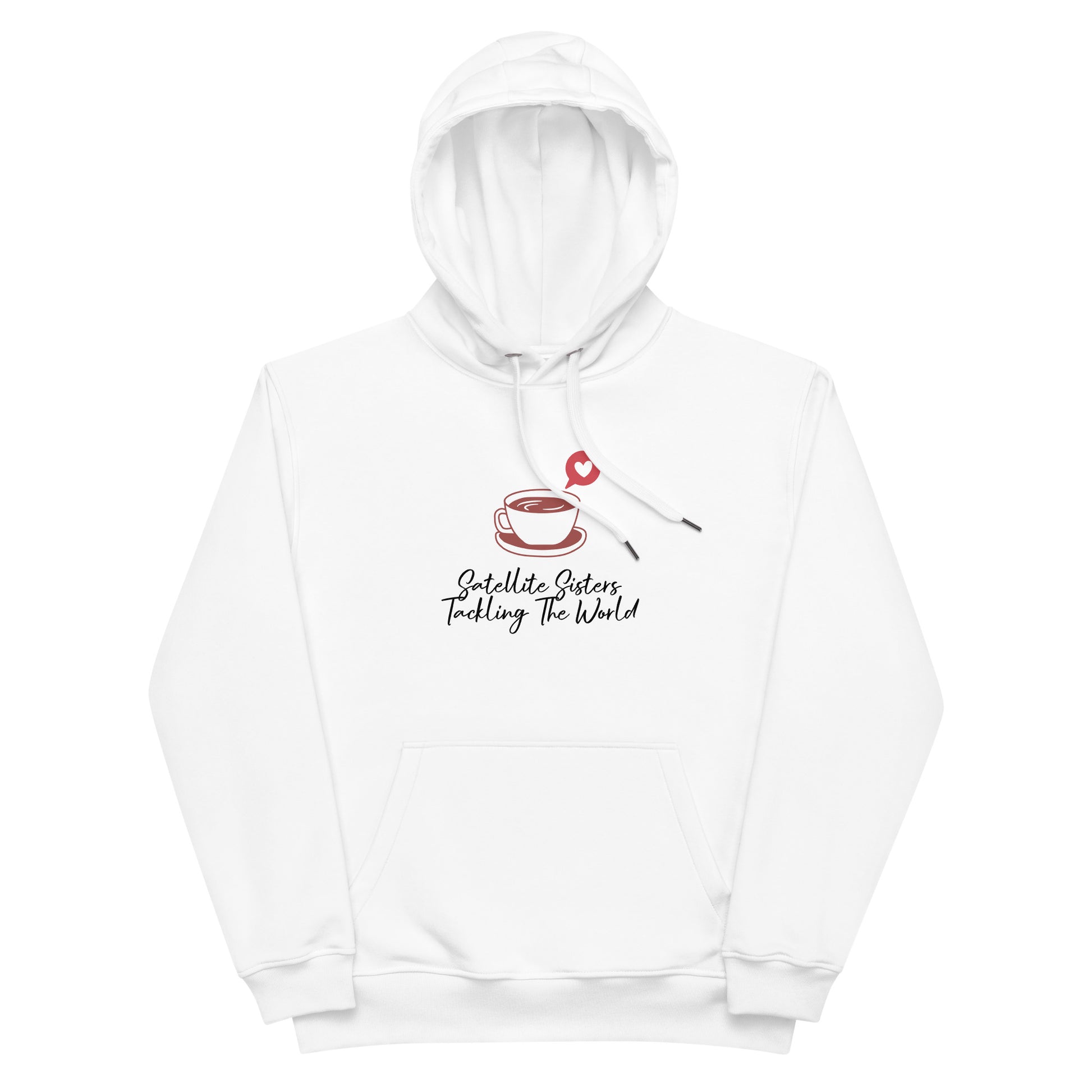Satellite Sisters Tackling The World One Cup Of Coffee At A Time. Meet the premium eco hoodie made of organic and recycled materials. With its comfortable fit, front pouch pocket, and double-layered hood, the hoodie is a classic streetwear piece that can be styled with multiple different looks.
