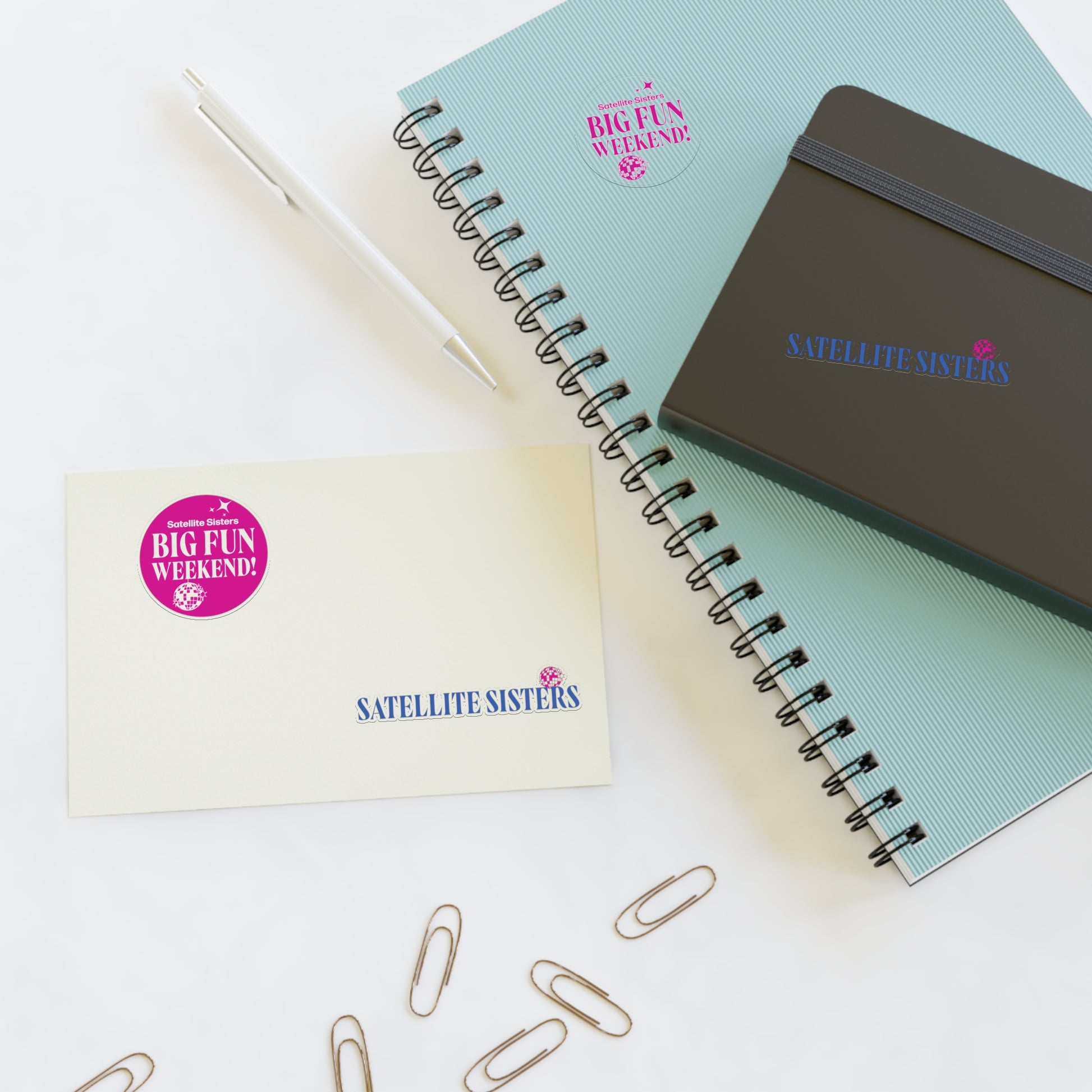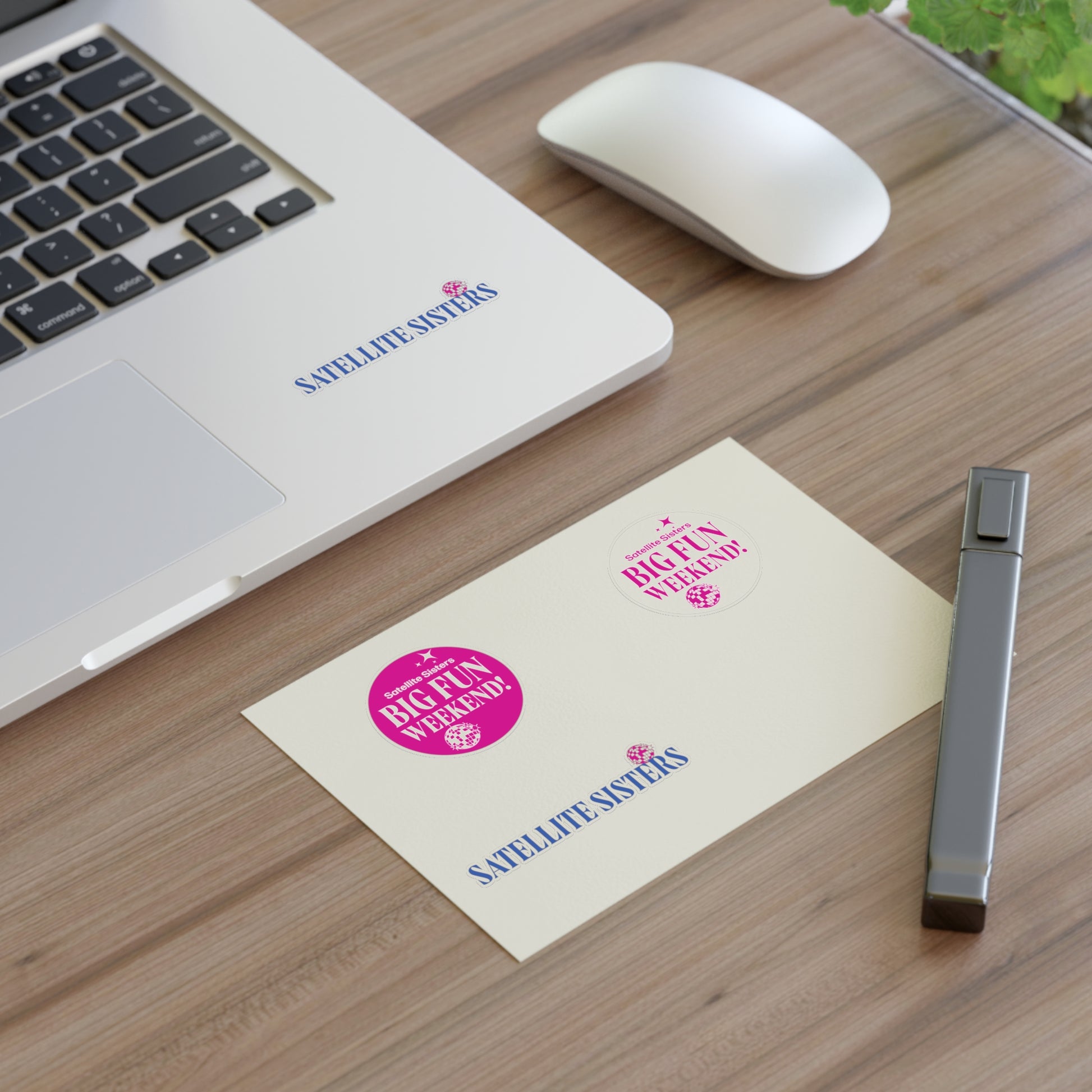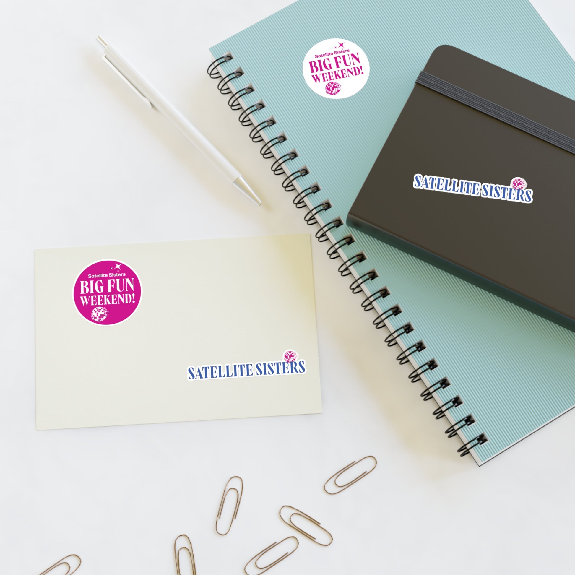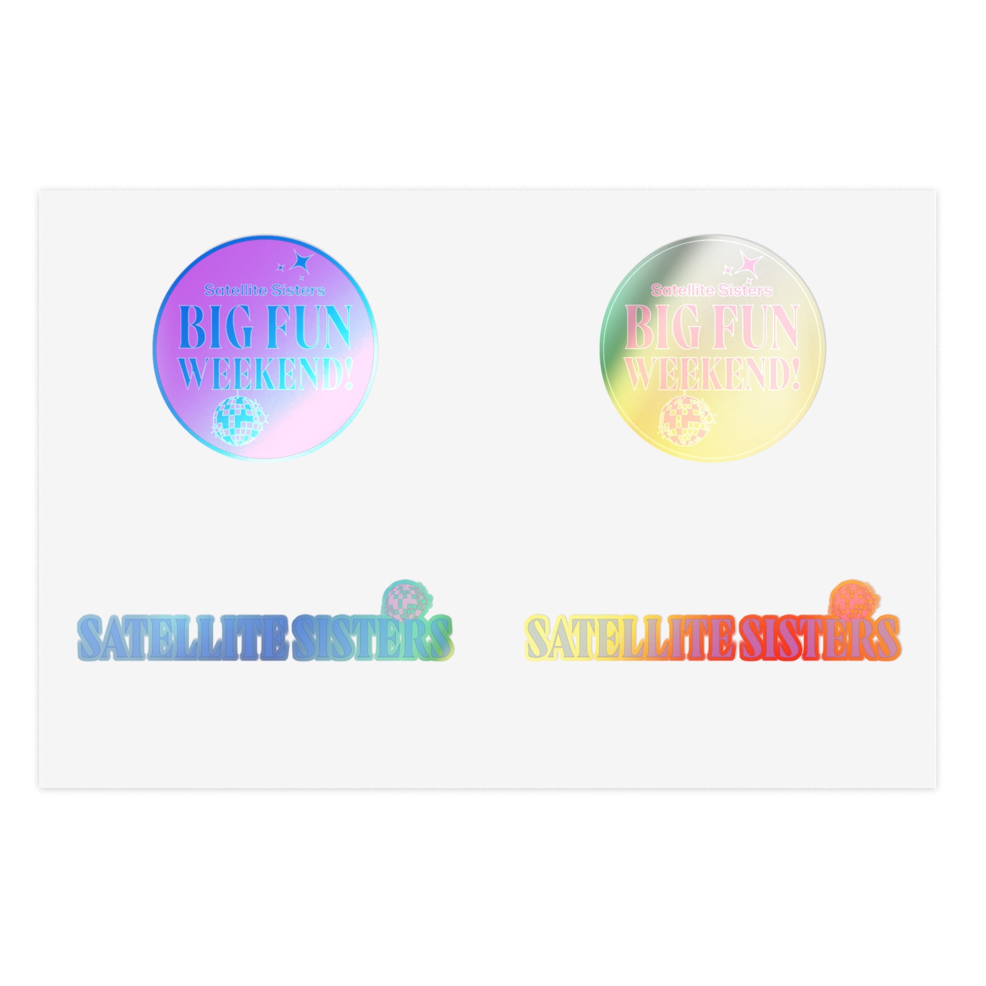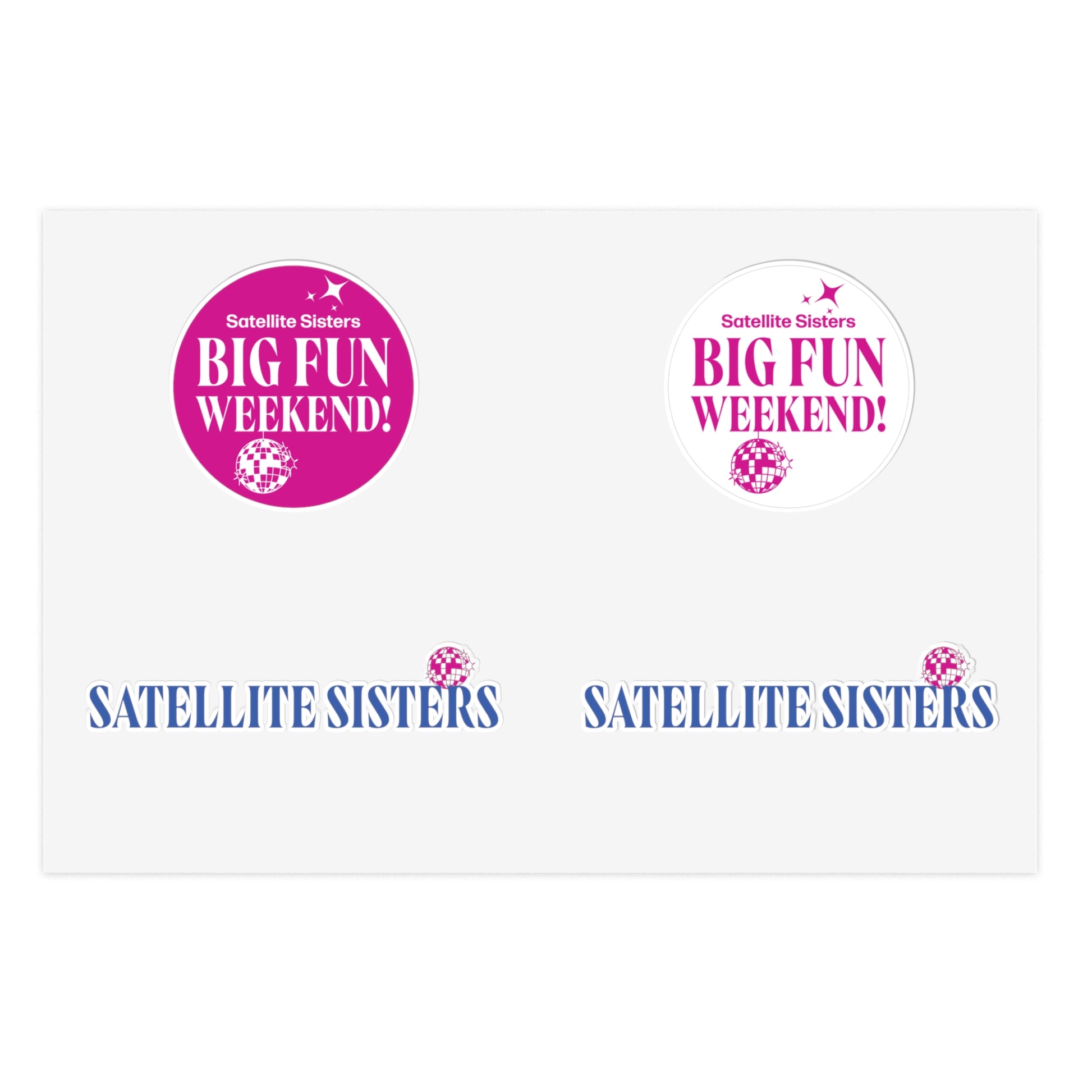 Our vinyl sticker sheet gives you the multiple Satellite Sisters and Big Fun Weekend logo designs. Available in white, holographic, and transparent versions to choose from.