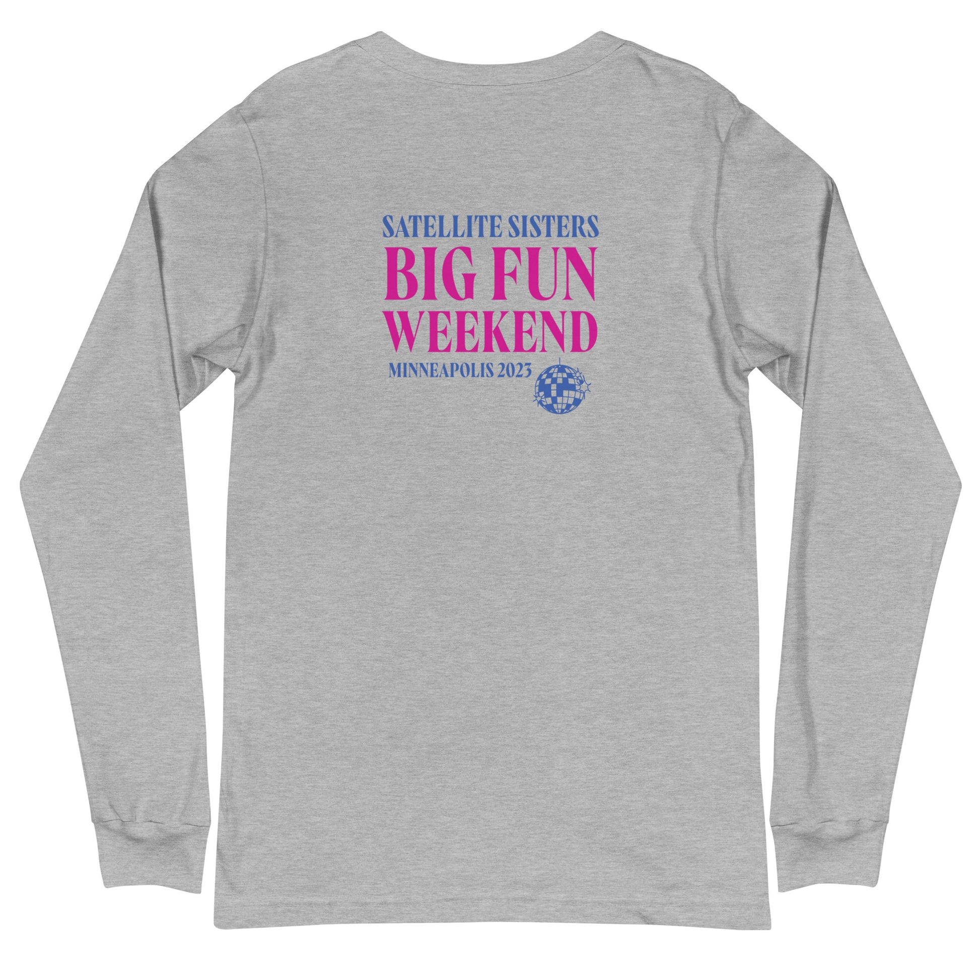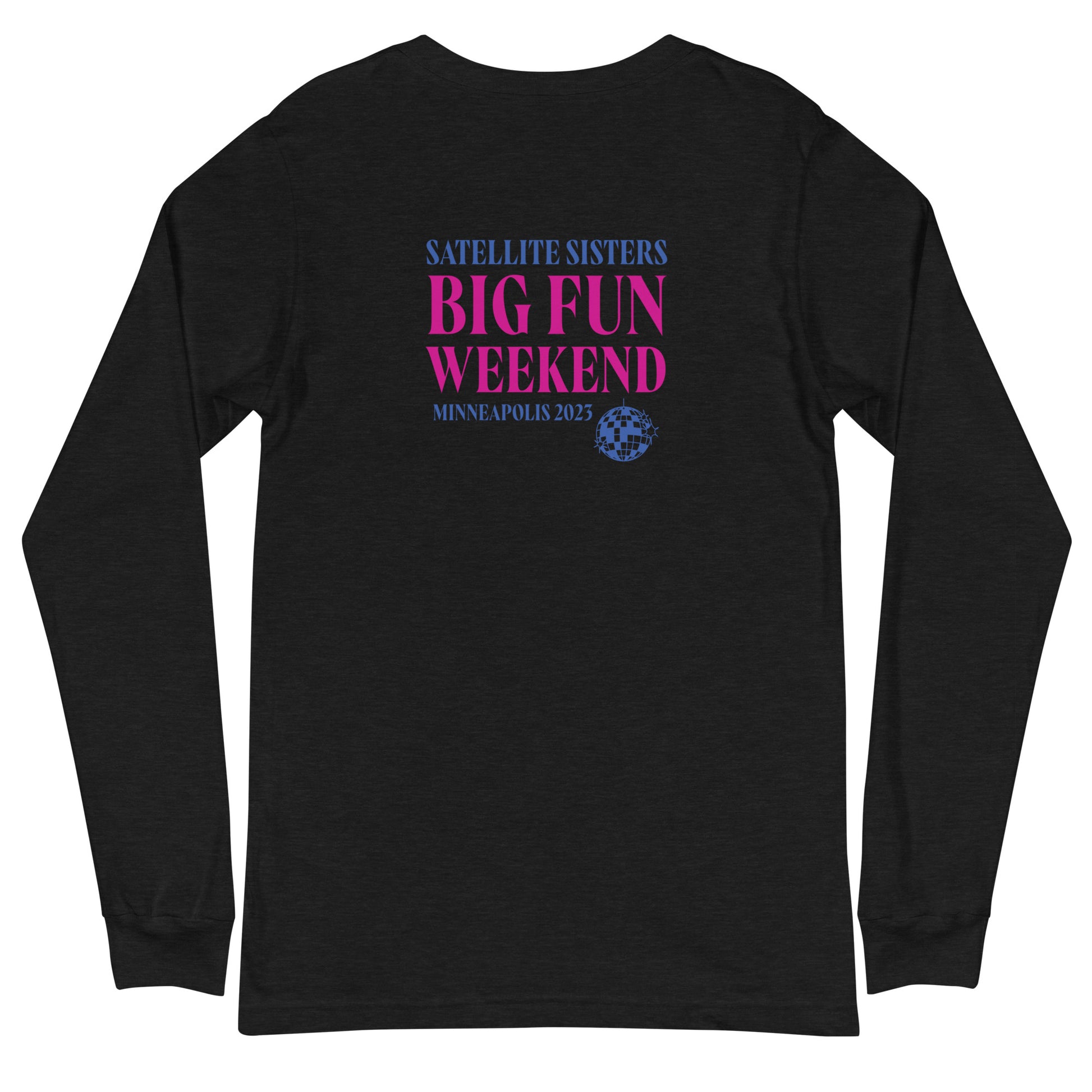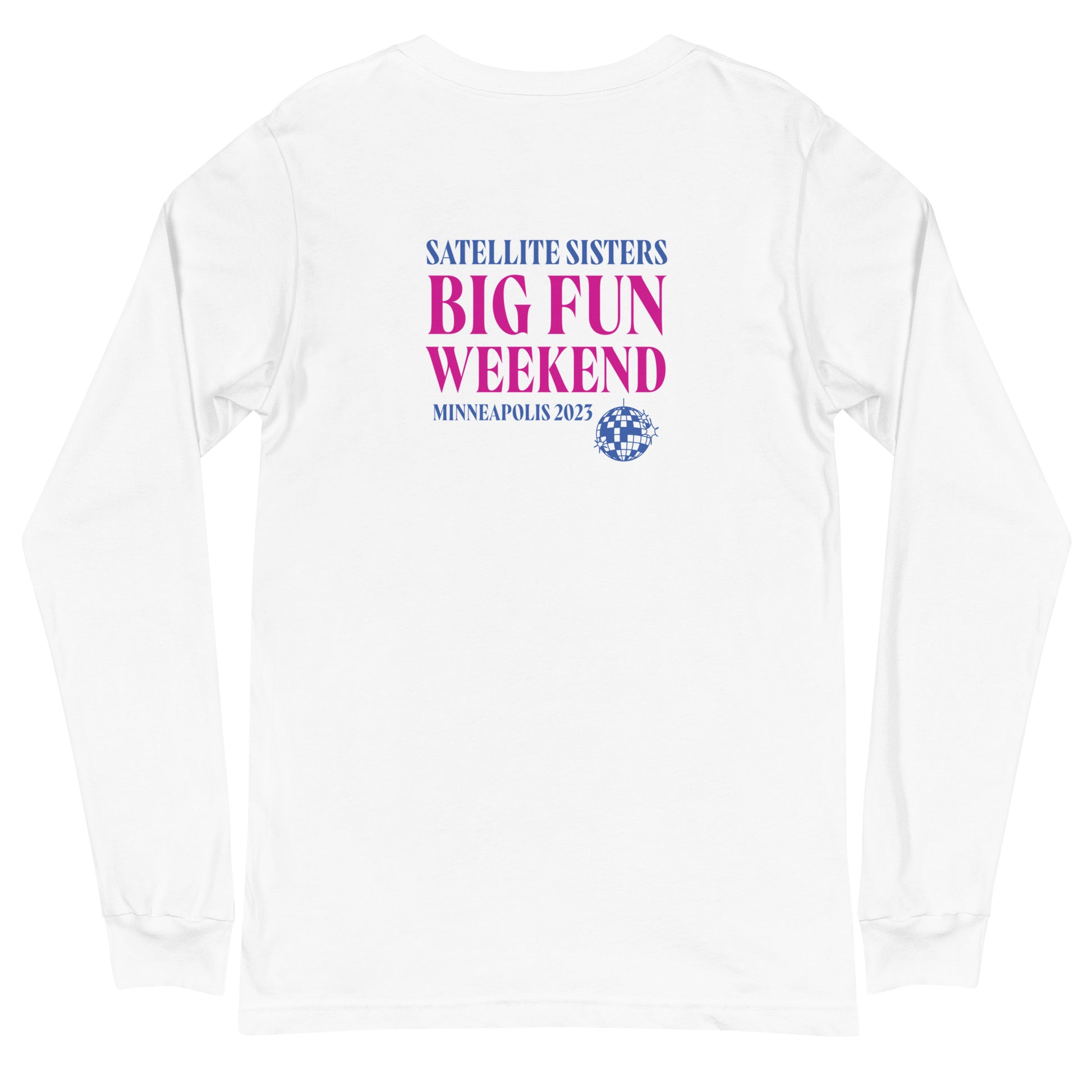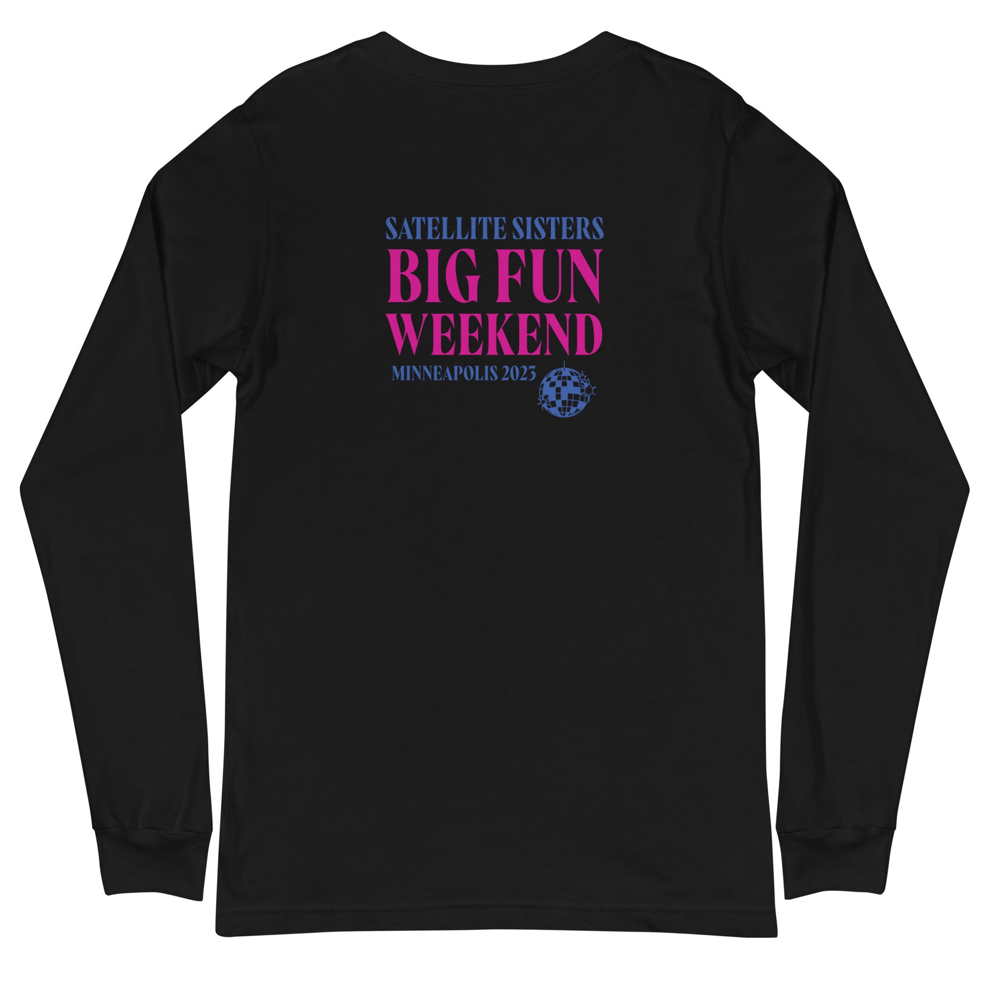 Unisex Long Sleeve Tee Satellite Sisters Logo + Big Fun Weekend Logo