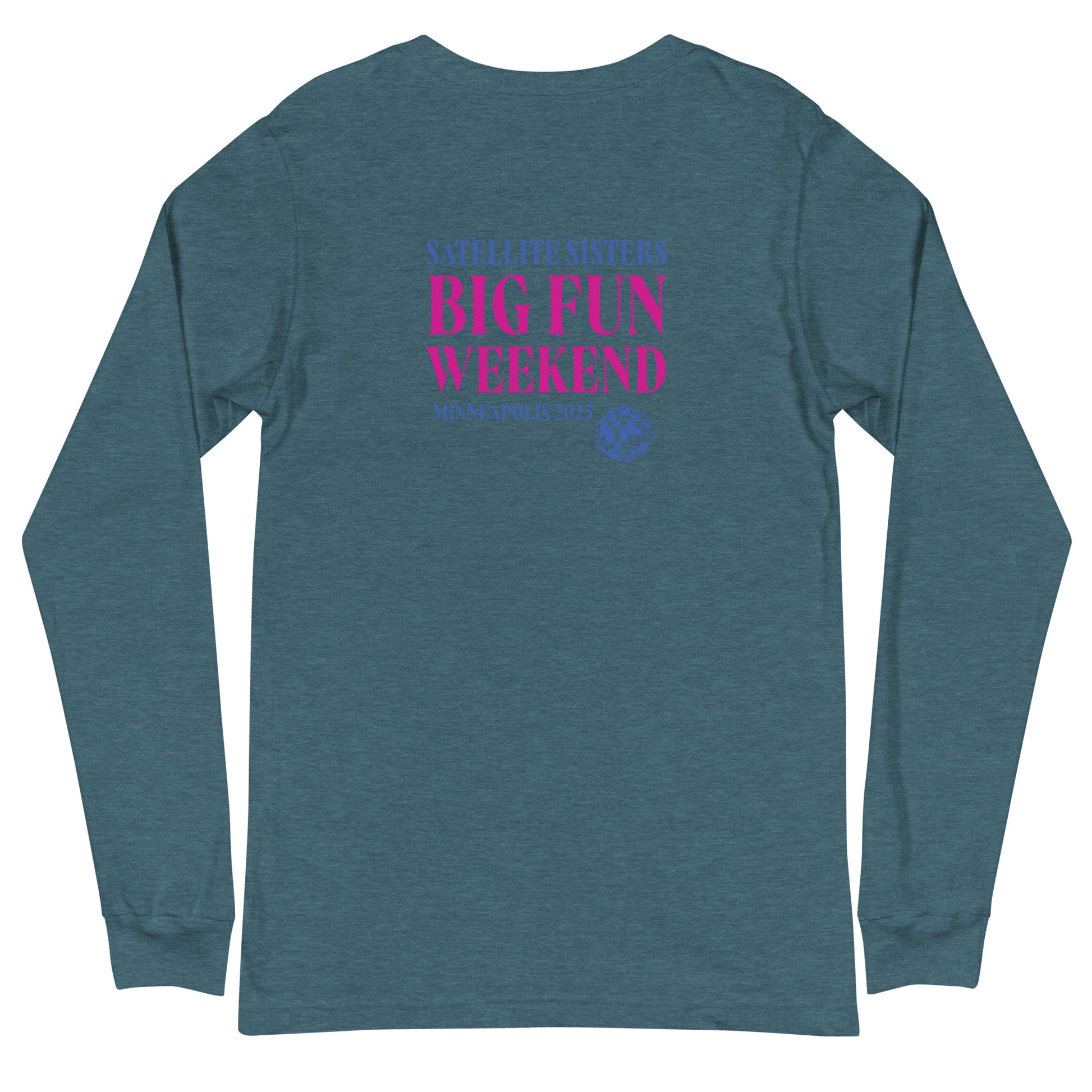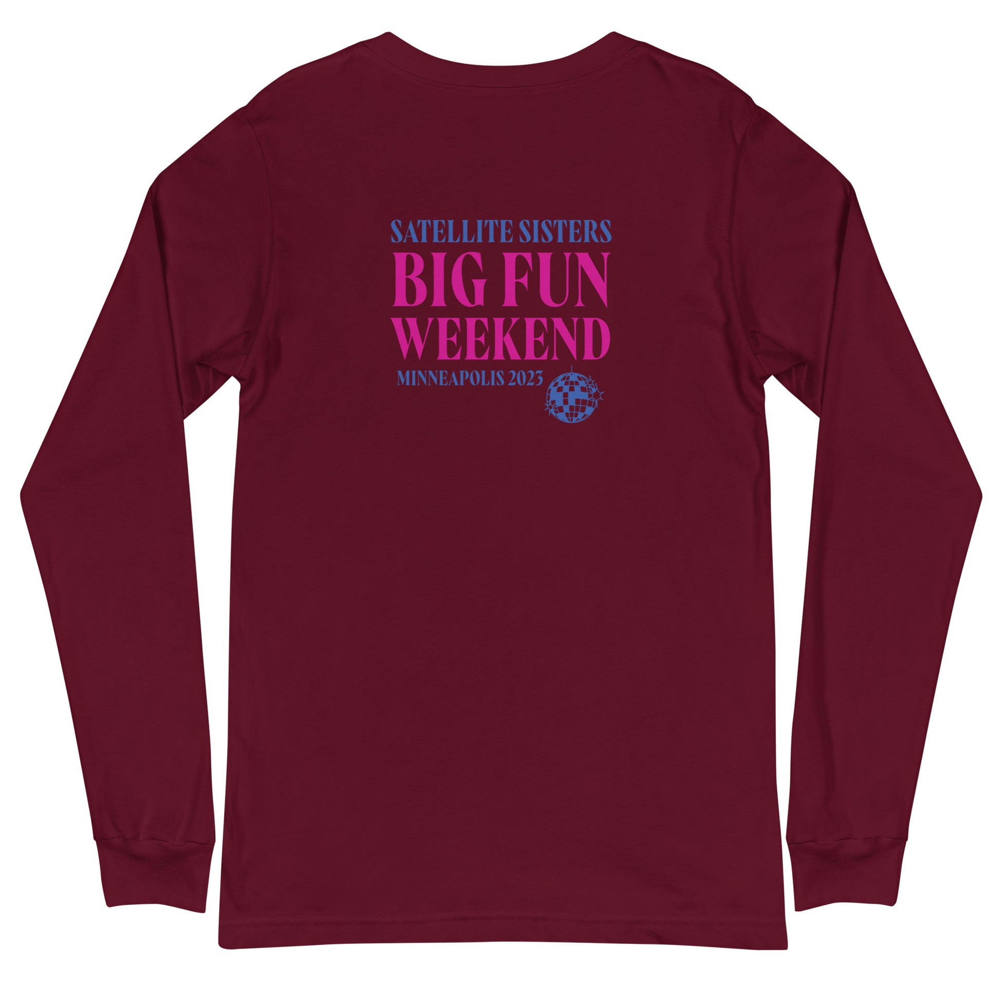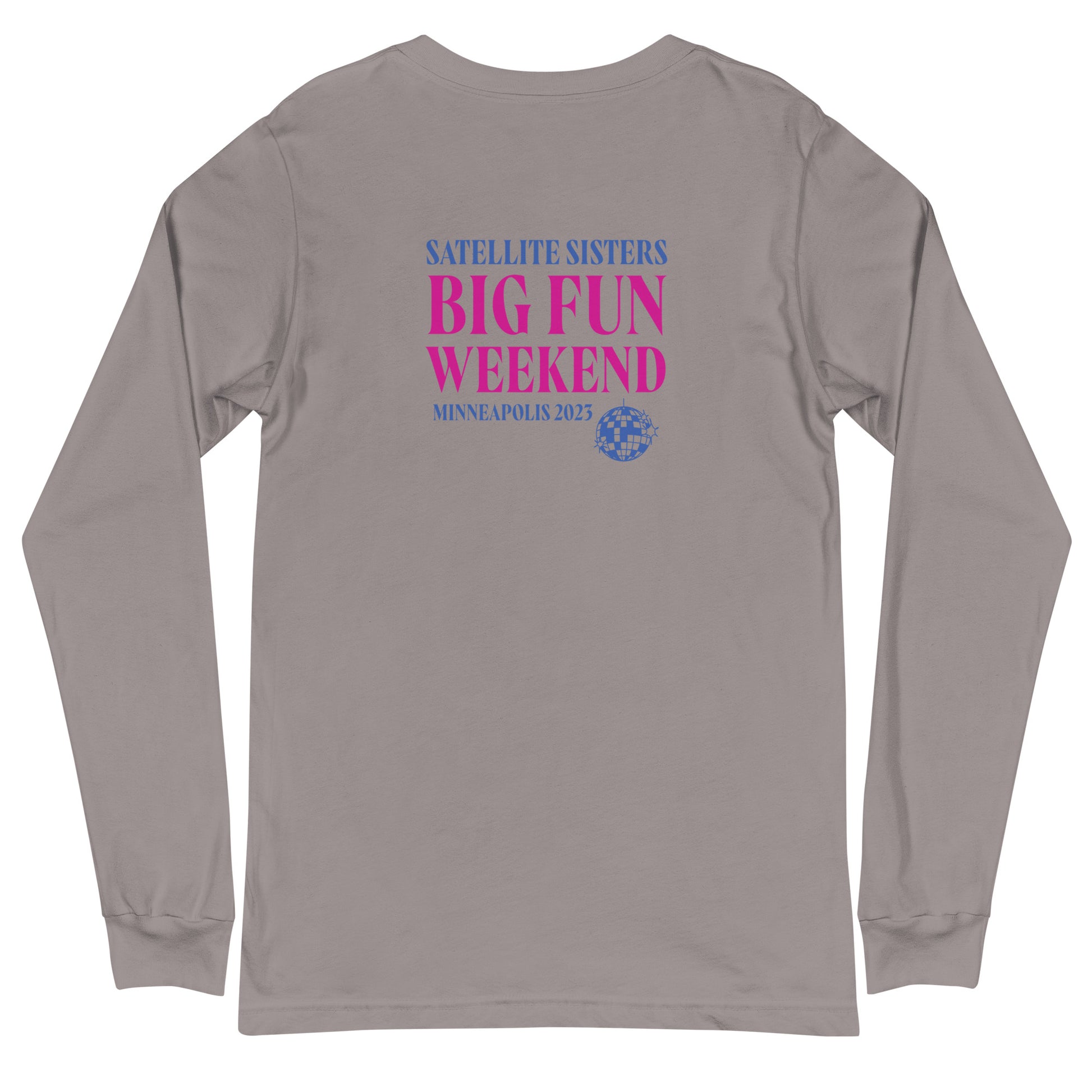 Unisex Long Sleeve Tee Satellite Sisters Logo + Big Fun Weekend Logo